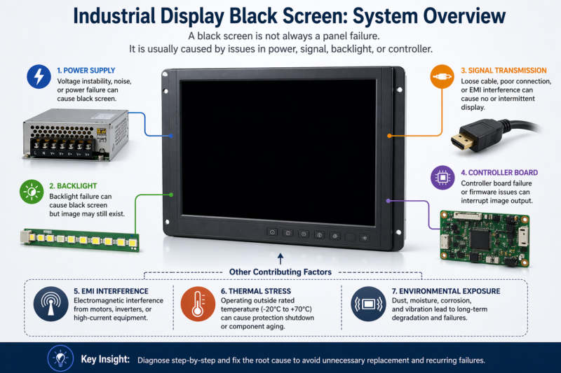 An industrial display black screen is a predictable system-level issue, not a random failure.