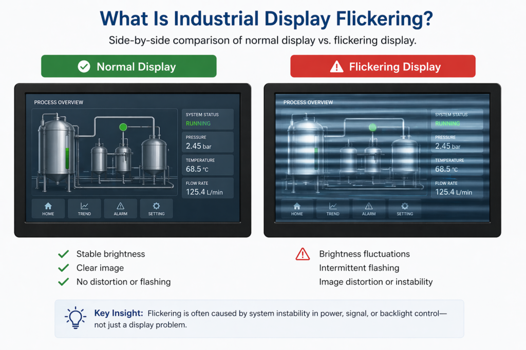 Industrial display flickering is a system-level issue involving power stability, signal integrity, and environmental conditions.