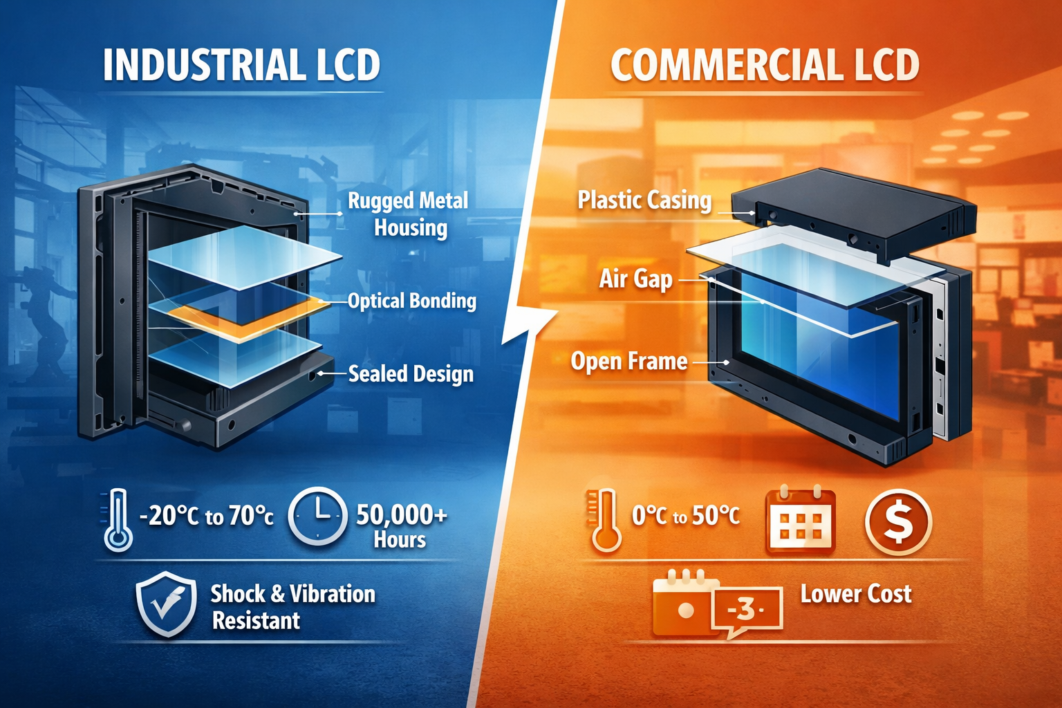 This article examines industrial LCD vs commercial LCD displays from an engineering and lifecycle perspective, focusing on reliability, deployment conditions, and total cost of ownership.