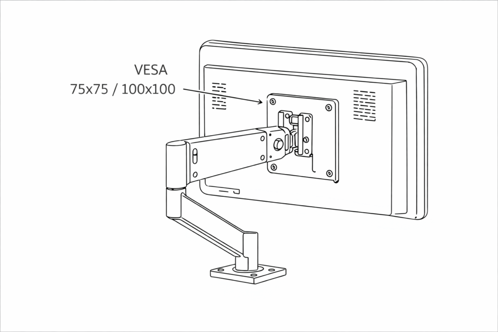 VESA mounting uses standardized patterns (e.g., 75×75 mm, 100×100 mm) for installation on arms, brackets, or walls.